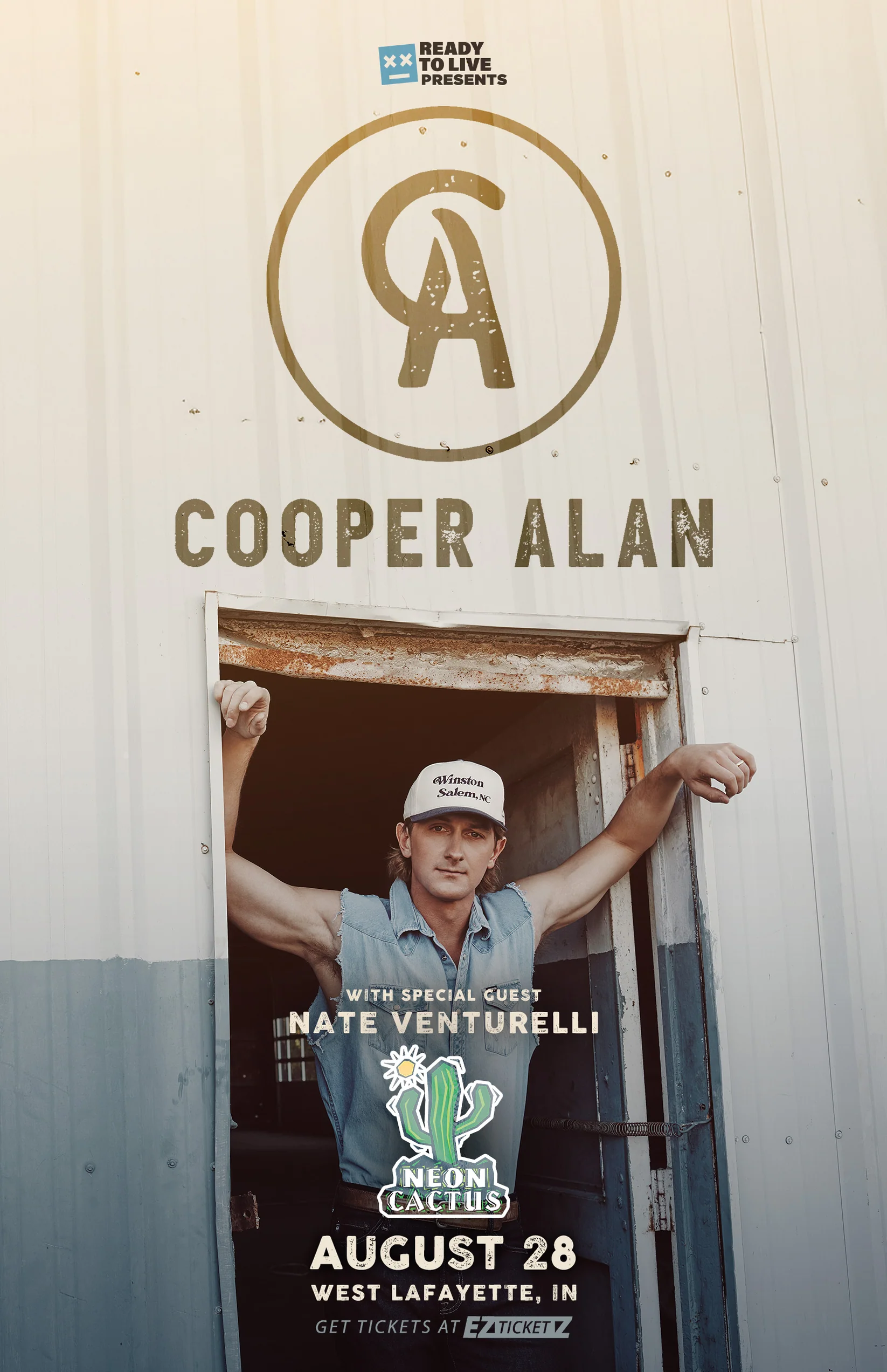 Get ready for a night of high-energy country music as Cooper Alan takes the stage at The Neon Cactus on August 28, 2025! From viral hits to fan favorites, Cooper brings his signature sound and electric performance style to West Lafayette for one unforgettable evening. The party kicks off at 7:00 pm and keeps going strong until midnight. Don’t miss special guest Nate Venturelli, who will be opening the night with his own crowd-pleasing set. Join us at The Neon Cactus, 360 Brown St, West Lafayette, IN—this is one show you don’t want to miss!